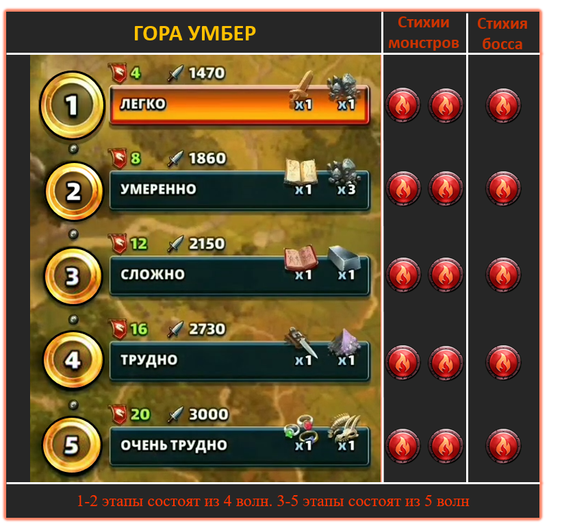 Гора Умбер – один из квестов на предметы для перерождения 4 и 5⭐ героев. В этом квесте можно получить скрытый клинок и мистические кольца, которые нужны для перерождения героев стихии огня. В связи с повышенными затратами энергии на прохождение, продолжительность квеста увеличили и она составляет 1,5 дня. Затраты на прохождение – 60 энергии.